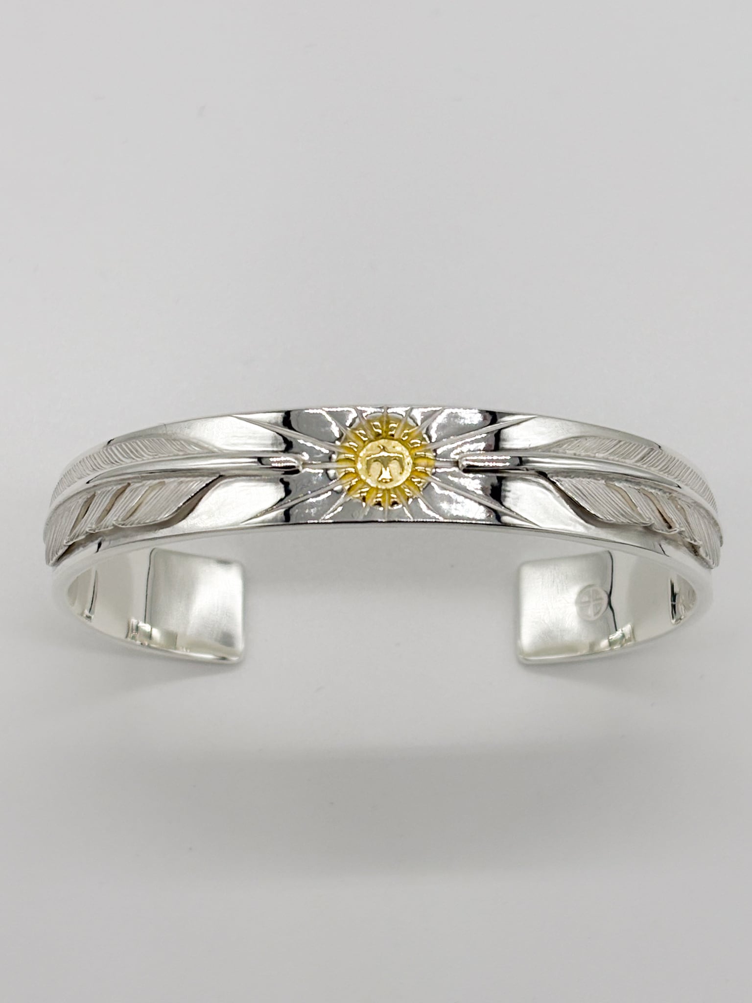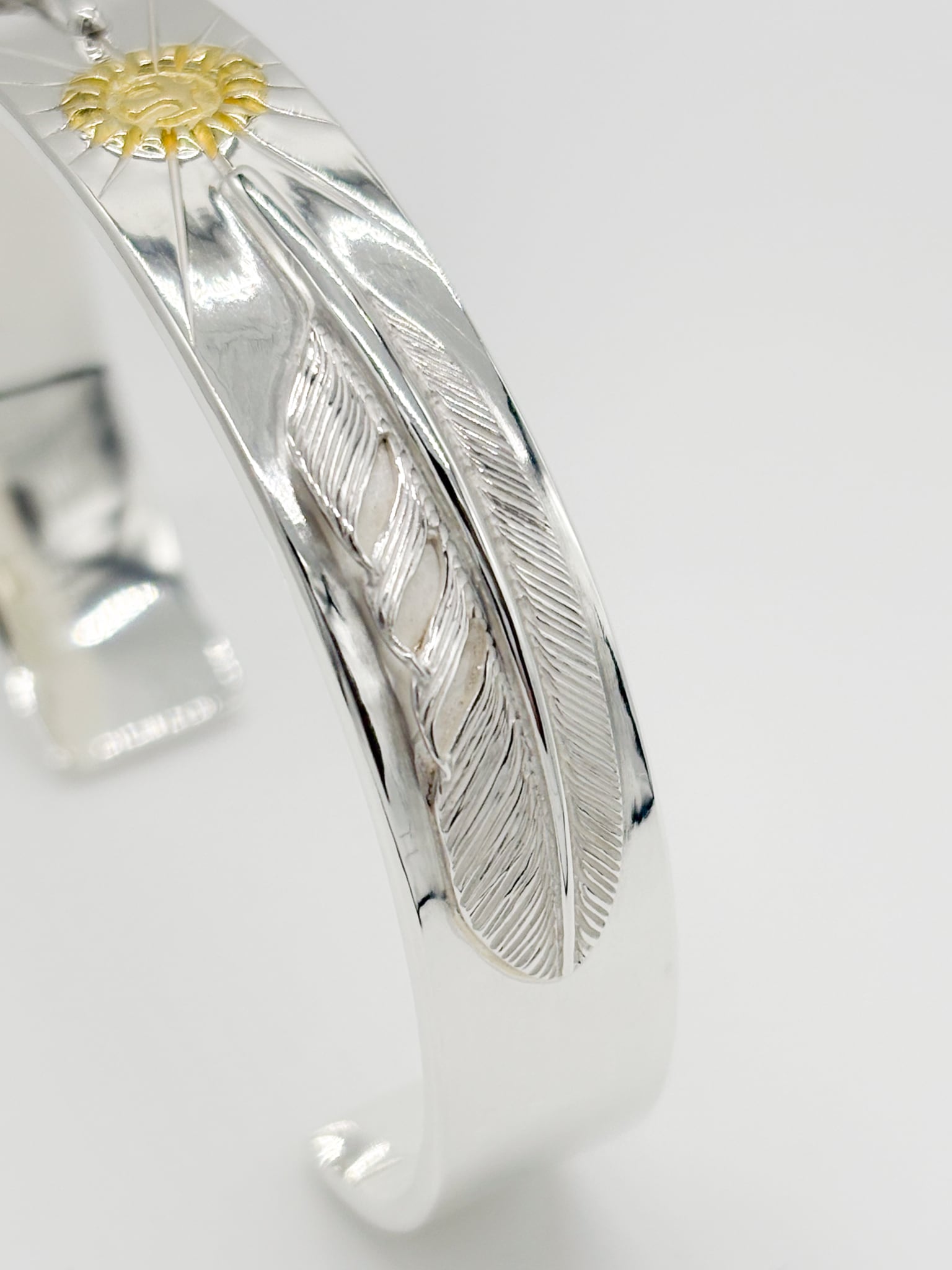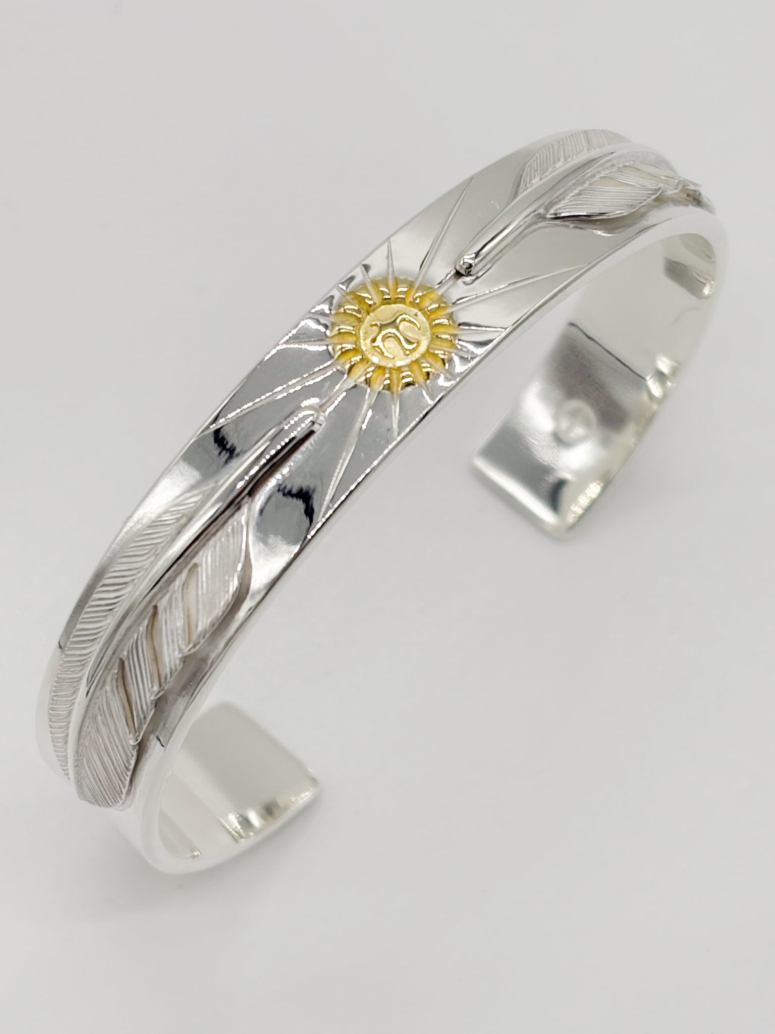 センターの太陽彫りの両サイドを小フェザーで固めたバングル。