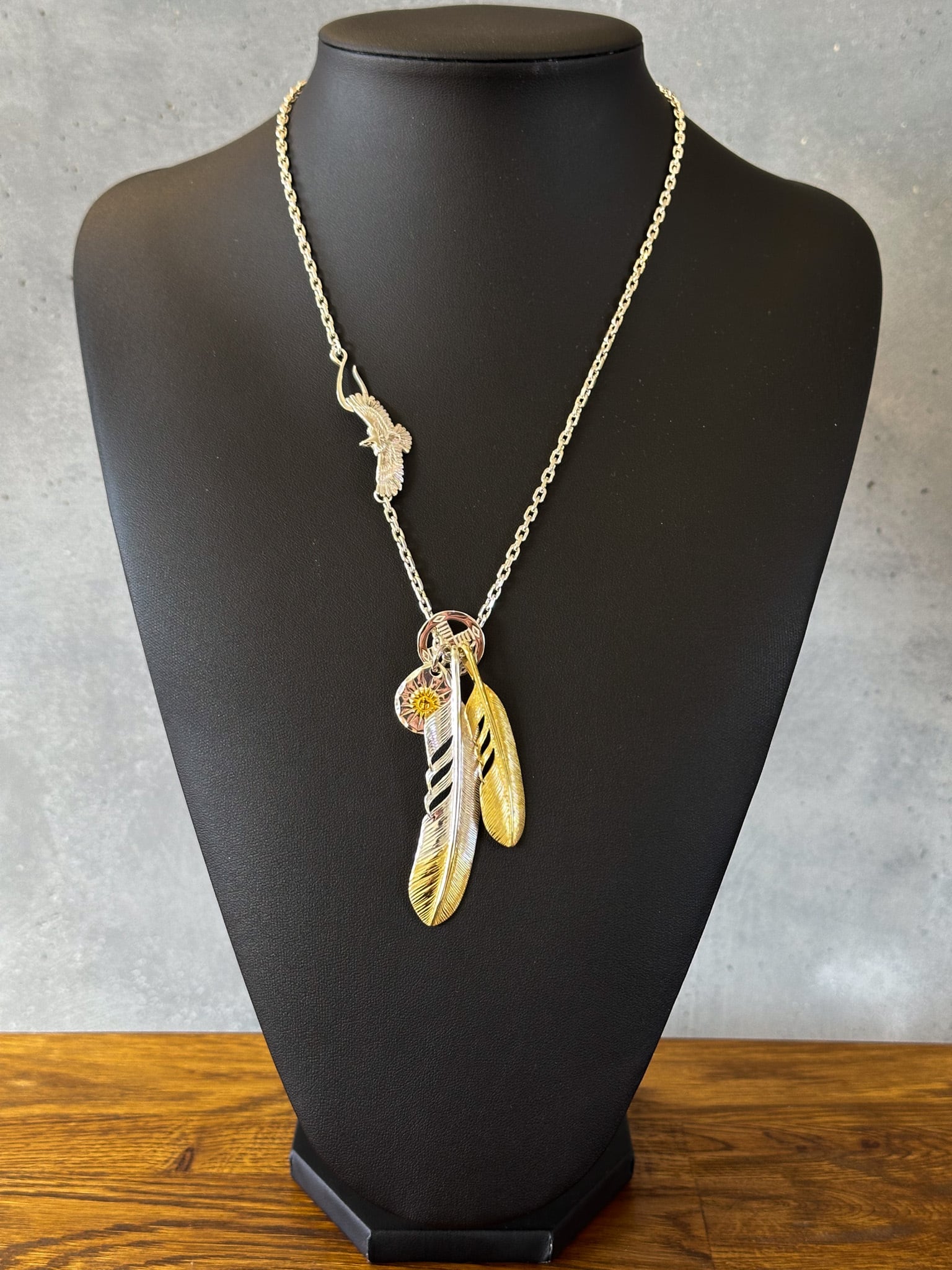 先金フェザーと全金中フェザーをで組んだ煌びやかなネックレス。